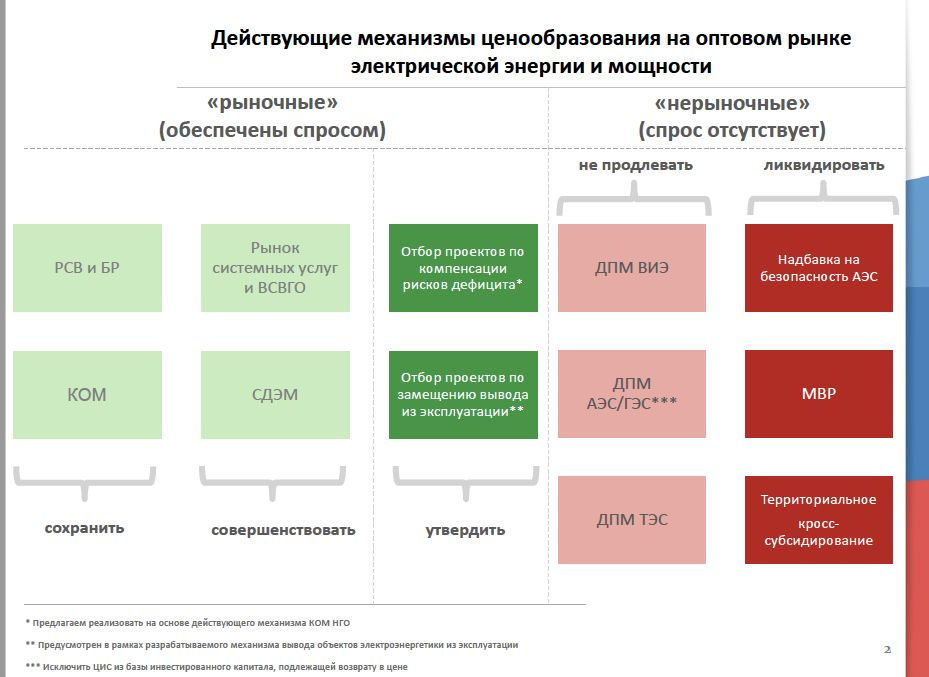 Здесь четко определены рыночные и нерыночные, по мнению министерства, механизмы. И ДПМ отнесены к нерыночным, не зависящим от спроса. Не очень, правда понятно, почему отборы по компенсации рисков дефицита отнесены к рыночным (при том, что есть и КОМ) и чем они принципиально отличаются от ДПМ – там ведь тоже были «риски дефицита» исходя из представлений РАО ЕЭС и г-на Чубайса лично с его пресловутым крестом, которые потом вылились в итоге в 40 ГВт избытков. Еще менее понятна рыночность в отношении проектов по замещениям выводов из эксплуатации. Вообще-то это решается нормальным рынком в рабочем порядке – если существующая генерация более невыгодна в данном конкретном месте, то она замещается другим ресурсом, который проходит отбор. Все остальное, о чем рассказывает презентация Минэка к рынку относится очень опосредованно, и странно, что чиновники этого не понимают или же просто делают вид, облекая регулируемые инвестиции в псевдорыночные одежды. Это не что иное, как конкурсные механизмы отборов регулируемых проектов с заданными в финансовой модели параметрами доходности, сроками окупаемости и т.д., в которых рыночные риски у участников сведены к минимуму и возложены регуляторами, организующими такие конкурсы, в полном объеме на потребителей. Точно также как и в случае с ДПМ или например, конкурсами ВИЭ за рубежом. Беда здесь часто в том, что регуляторов, которые всё это придумывают и вроде бы должны потом ответить за результаты своей деятельности по завершении таких инвестпроектов, как правило "уж нет, а те далече", в персональном смысле. А те, что есть, разводят руками и рассказывают нам о том, что любые крупные решения всегда компромиссны – так уж получилось.